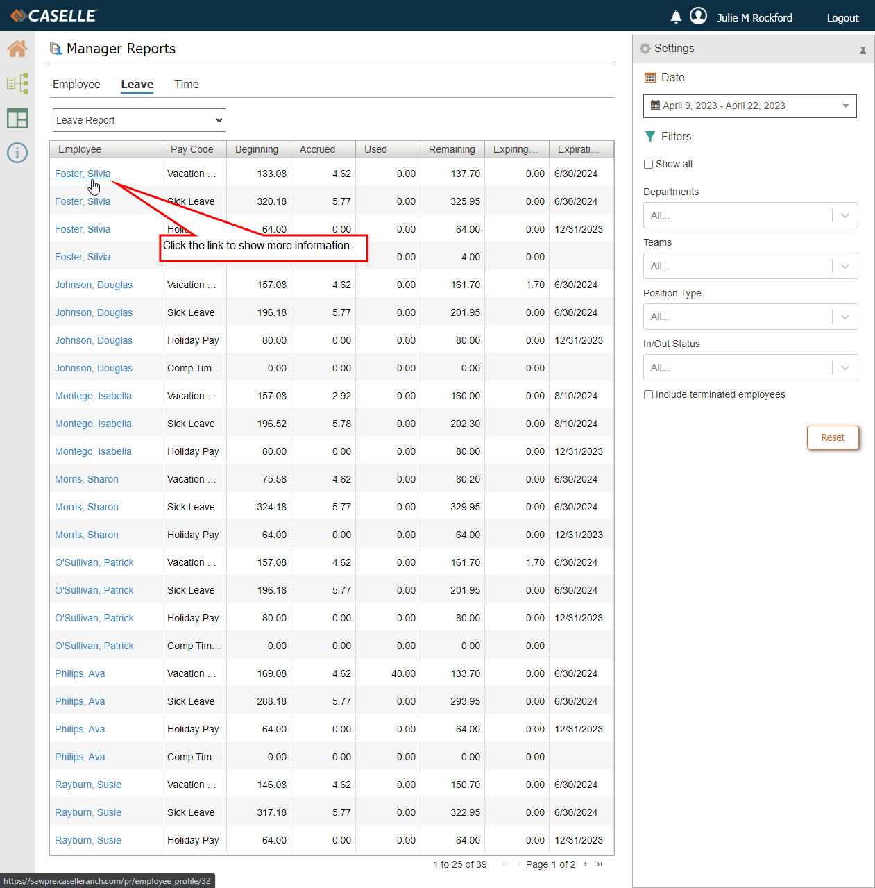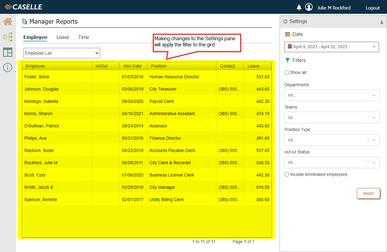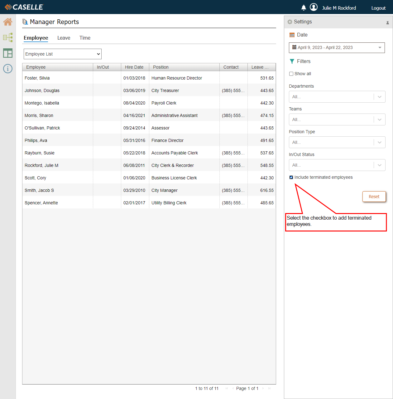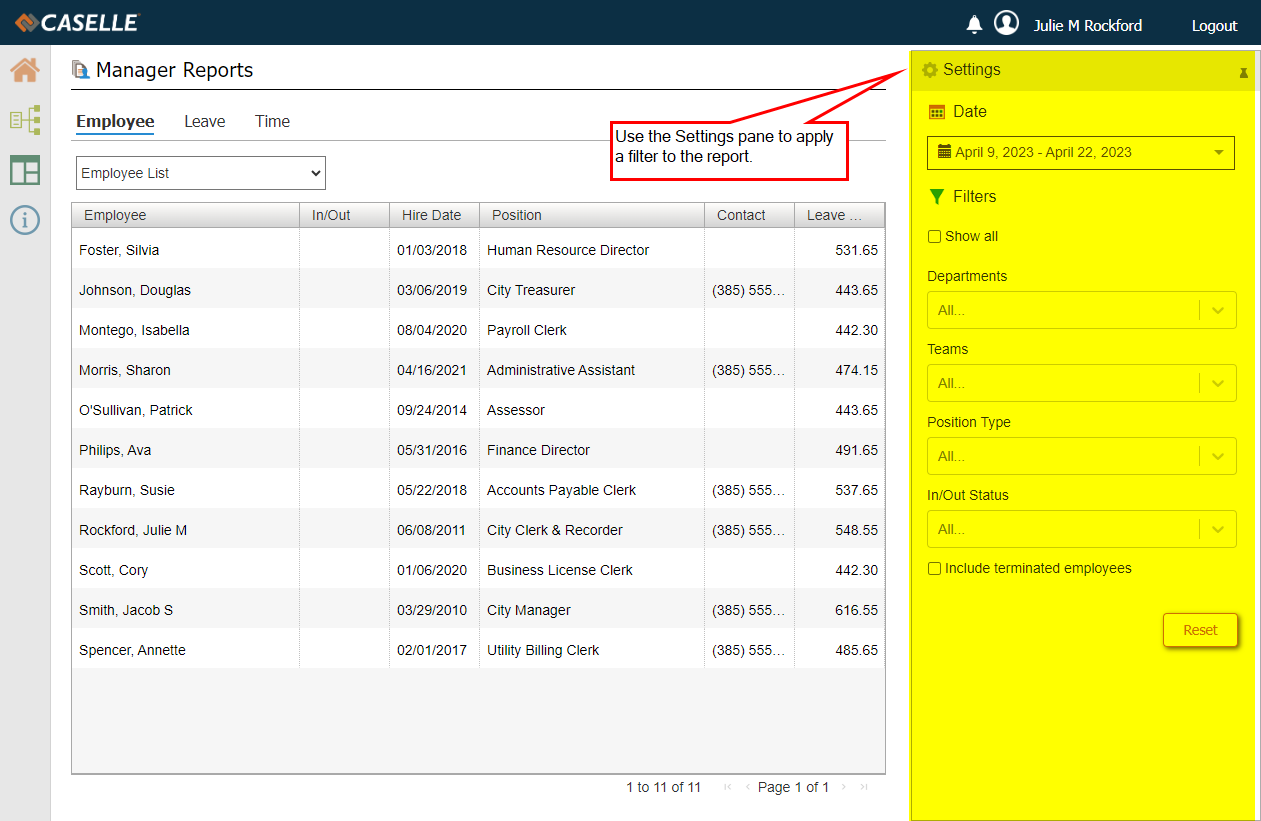 Change the report date range and filters on Manager Reports. Use the report criteria to filter data that is included in a report. For example, you can use the report criteria to list all of the employees in payroll or just include data for a single employee; change the report date range; and include or exclude information by department, team, position type, or In/Out status.