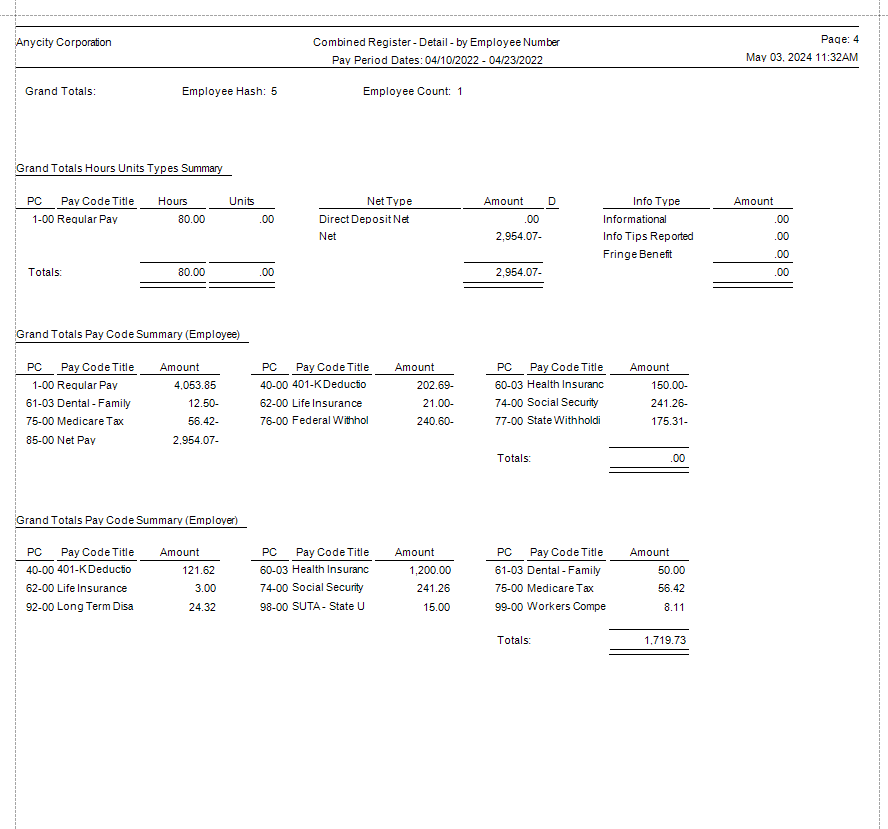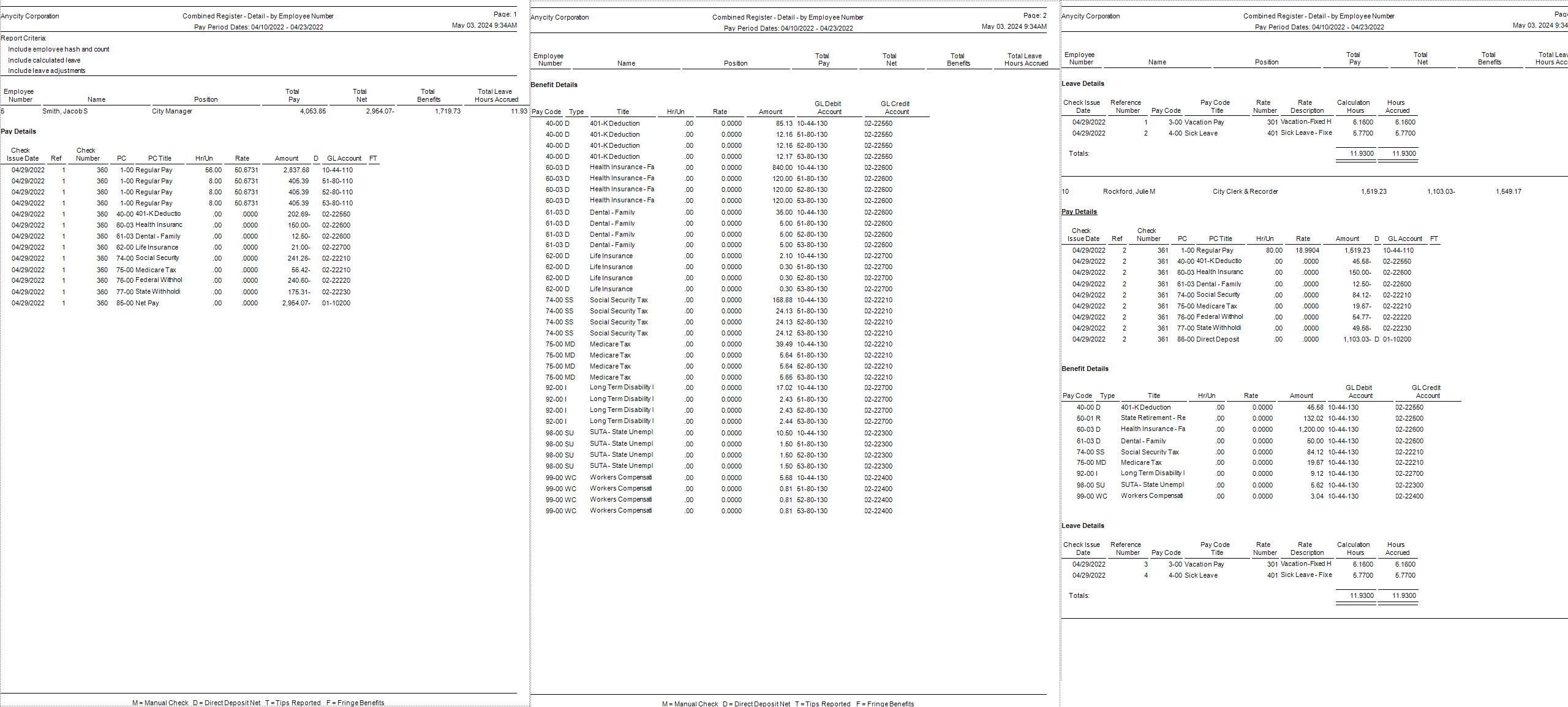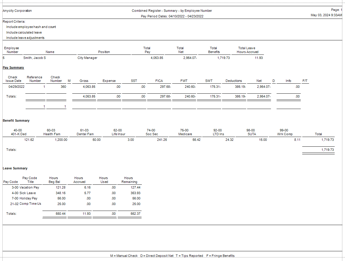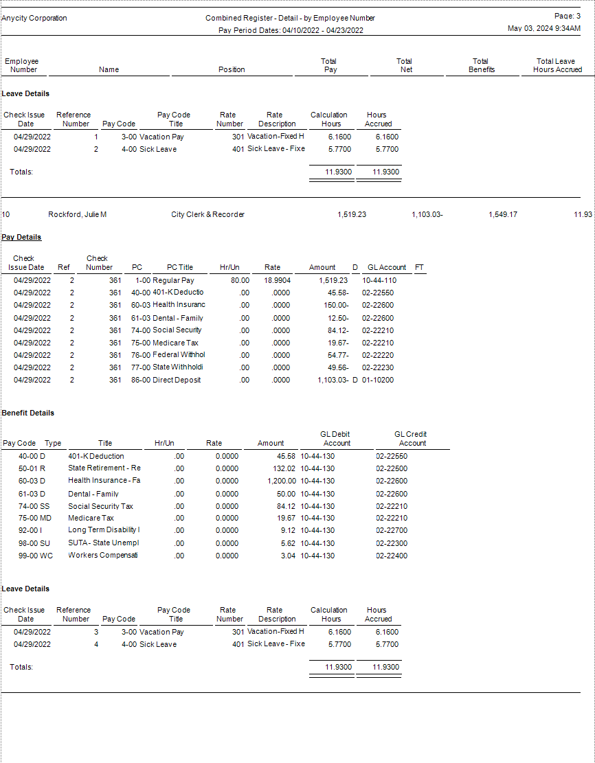 The combined register report combines the information from several key payroll reports into one report for easier viewing and analysis. This report can be useful for reviewing employee payroll transactions and balancing quarterly and year-end totals. It can display the employee checks, benefits, and leave.