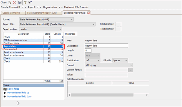 Set up the electronic file format for a state retirement report to print the report for the date range ending in MM/15, MM/30, or MM/31 even though checks for the pay period were processed on a different date. This option is available in the state retirement report for Oregon and Idaho. If you need this option for printing state retirement reports, contact customer support at (800) 228-9851.