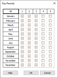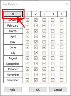 A (All) selects all pay periods. For example, sick leave accumulates based on fixed hours will accrue in all pay periods.