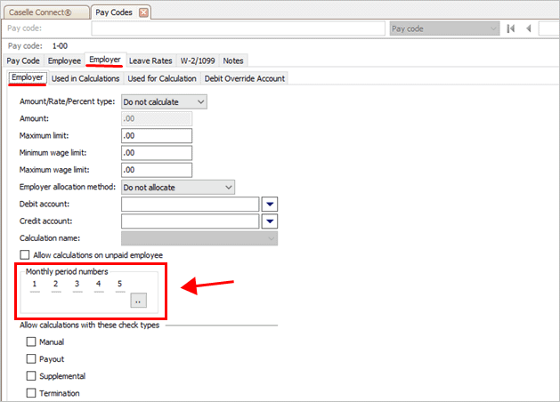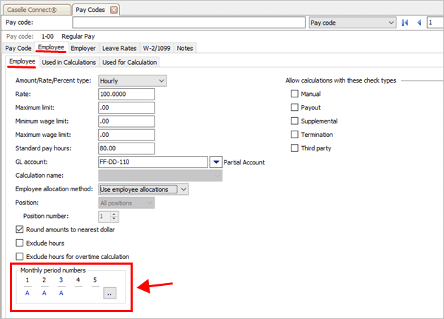 Where is the section titled Monthly Period Numbers? Open Payroll > Organization > Pay Codes. There's a section titled Monthly Period Numbers on the Employee tab and the Employer tab.