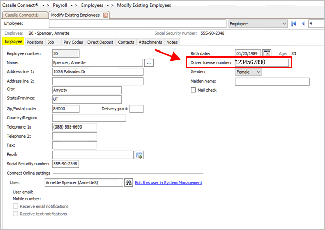 3. Use the Driver License Number box to enter the employee's driver license number.