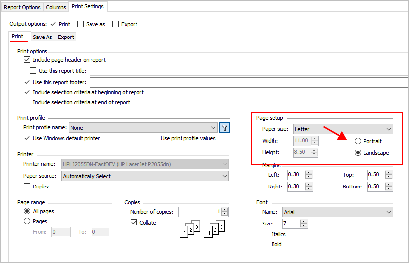 Use the Page Setup options to change the page orientation from Portrait to Landscape. For example, use Portrait to print the report on 8.5 inch by 11 inch paper. User Landscape to print the report on 11 inch by 8.5 inch paper. Portrait (8.5 by 11 ...