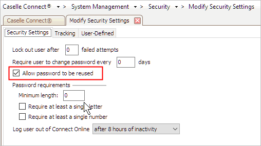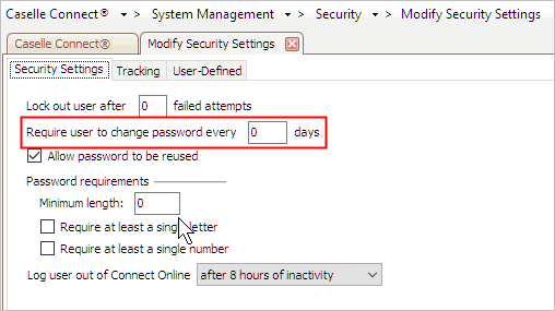 You can set up the security settings in Connect to force a user to change their user password. There is only one control in Connect but it controls the valid password period in both Connect and Connect Online. You can also allow Connect and Connect Online users to recycle one of their old passwords to use as their new password.