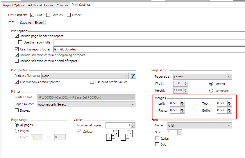 Change the report margins to increase or decrease the available printing area on a page.