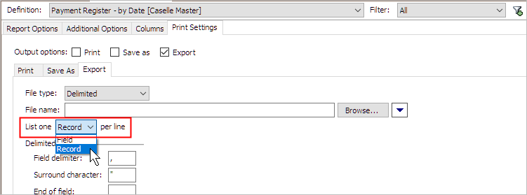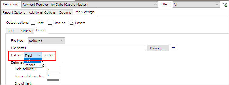 Select the checkbox to create an export file that lists all of the values for a record on a single line. For more information, see the help topic titled What does list one record per line mean?