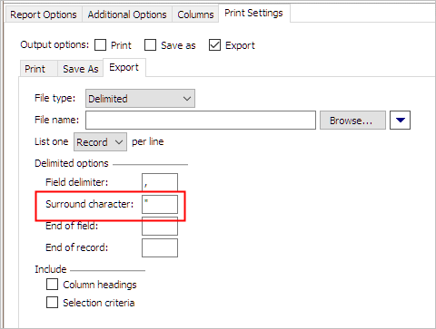 Type a unique character or symbol that is not used in the file to surround text fields. Example: quotation mark ("), comma (,), semicolon (;), or Tab. For more information, see the help topic titled What is a surround character?