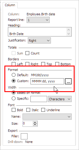 Connect will use the default format to print the values in a column. You can replace the default format with the format that best suits the purpose of the report.