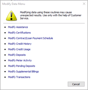 Warning! Contact Customer Service at (800) 243-8275 before you attempt to use Modify Data. The tools in Modify Data will modify or delete transactions. There is no undo for this routine. Before you get started Back up the Utility Management database. ...