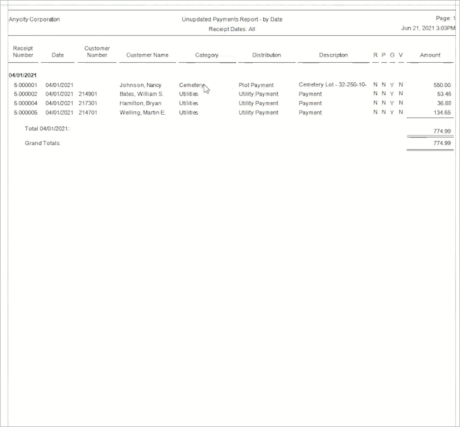 Use this report to search for payments that have not been unupdated to other Connect applications. Unupdated payments will not be reported as paid in the related Connect application even though the payment was received in the Cash Receipting application. When a user looks up an account in the related Connect application, the account will show an unpaid amount. That's why it's important to find unupdated payments and get those payments updated to the other Connect applications. For example, this report shows four payments that have not been updated to Cemetery Management and Utility Management.