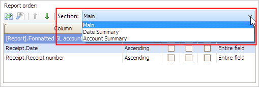 Each report is divided into reporting sections. A report section organizes data for a specific part of the report, for example, the Main section may include the bulk of the transaction information while the Account Summary section is displays only the account totals. When you select a master report, the report section is set up based on the needs of most of the people printing the report. However, you can select a report section to edit the content in it.