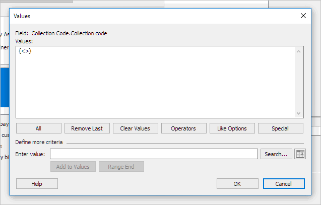 The collection code displays in the Enter Value field on the Values form.