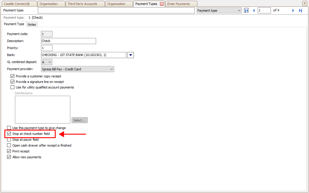 Change the default options on a payment type to stop the cursor at the Check Number field to prompt the cash receipting clerk to enter the check number. Stopping the cursor at the Check Number field will remind the cash receipting clerk to add the ...