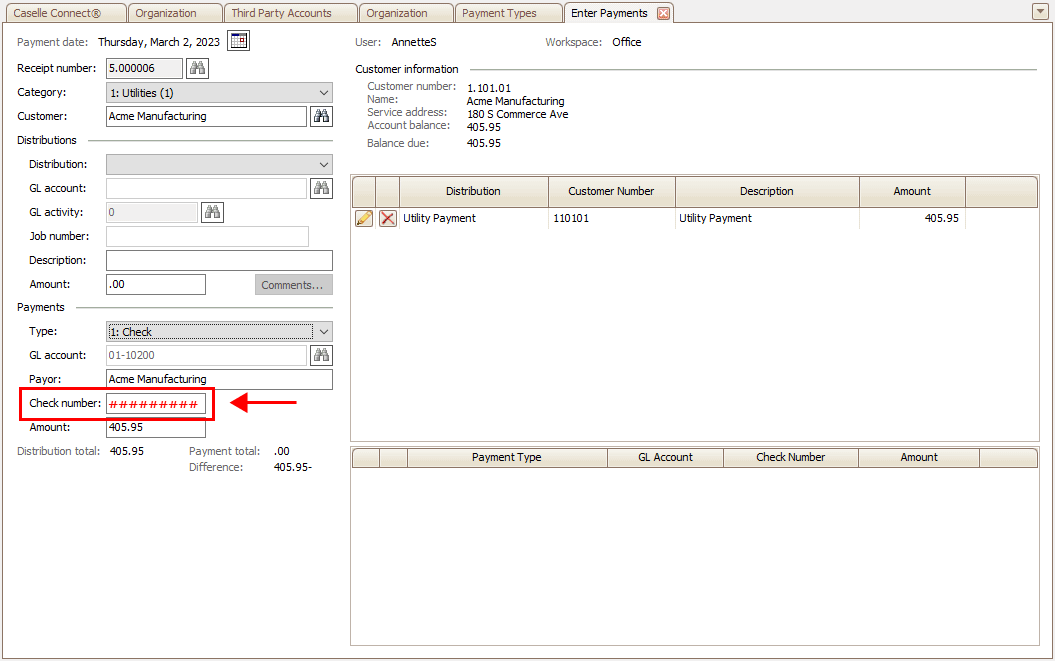 Example: Chris is the cash receipting clerk at City ABC. A customer uses a check to pay the amount due. Chris selects check as the payment type. When she presses the Enter key to move to the next field, the cursor will stop at the Check Number box. Chris enters the check number on the check and continues to save the transaction as usual.