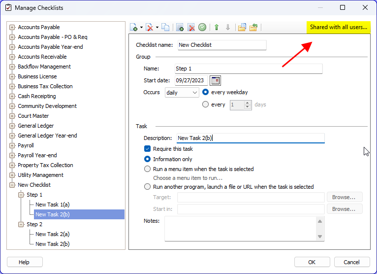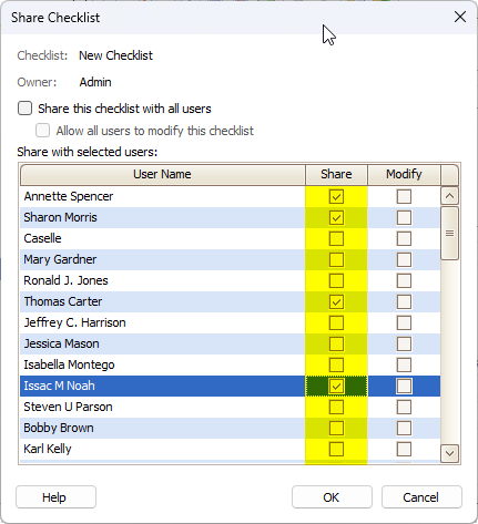 Manage Checklists, Shared with all users...