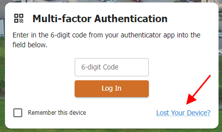 Use a recovery code (backup code) that you downloaded or copied to a safe location when you set up Multi-factor Authentication. Click Lost Your Device.