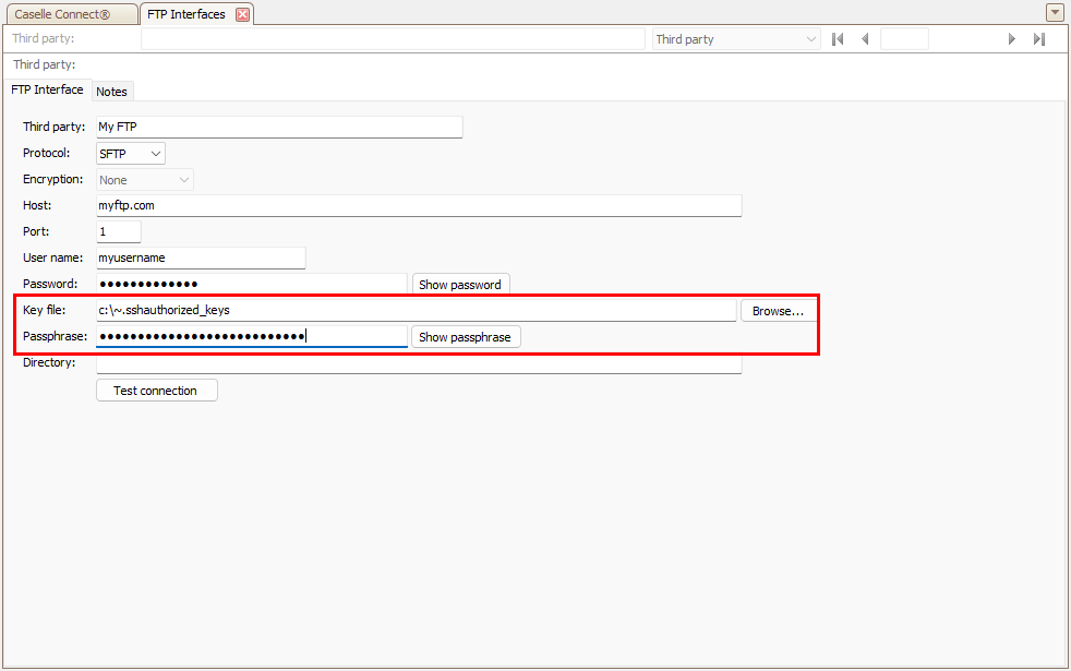 I am using an FTP server with Connect. To make it more secure, we are using a passphrase with the FTP server login process. How do I set up Connect to use the passphrase so the login is successful?
