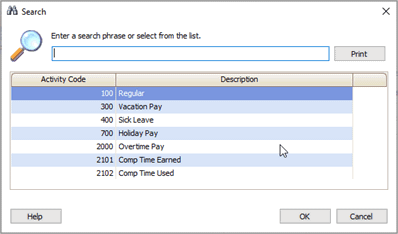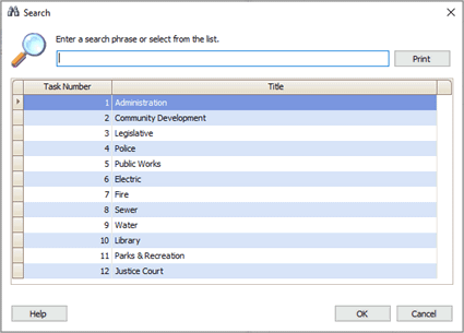 You can click the Search button at the end of the Activity box to look up activity numbers for the selected task. The activity numbers will display in a Search window.