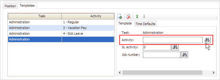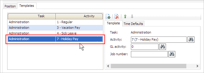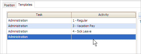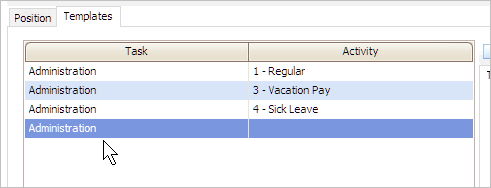 The activity code displays in the grid. The tasks and activities that display in this grid will be included in the timesheet template for the employee's position.