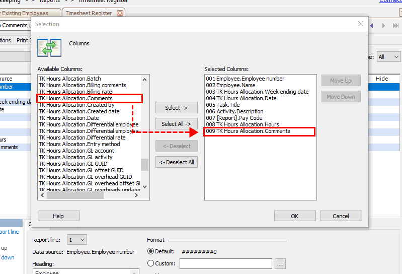 4. From the Available Columns list, locate TK Hours Allocation.Comments, and then double-click it to move it to the Selected Columns list.