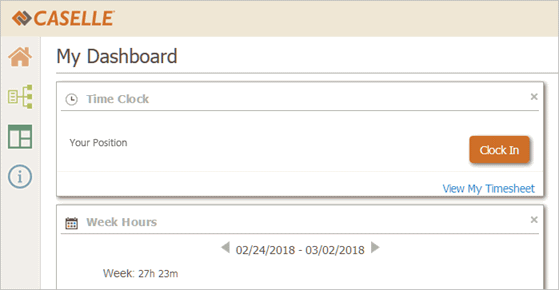 The Time Clock widget displays a Clock In button when you're clocked out and a Clock Out button when you're clocked in.
