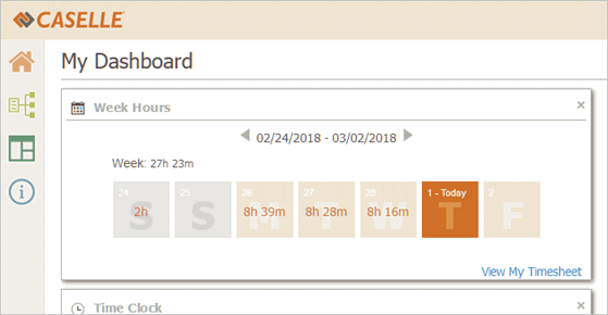 The Week Hours widget displays the days (S, S, M, T, W, TH, and F) in a workweek. Each day will show the total hours worked on each day.