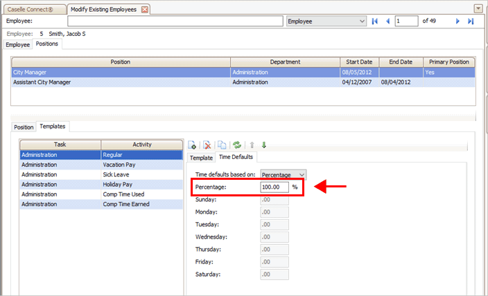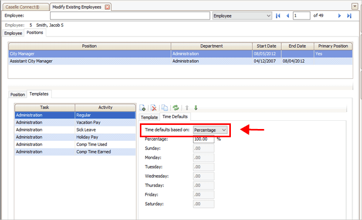 You can set up a different percentage for each task and activity. The percentage does not need to equal 100%. For example, Pat sets up a template for task 1, activity 1 for 60% and then Pat sets up another template for task 2, activity 2 for 40%. When the employee using the template enters hours, Connect will use the hours entered times the percentage to calculate the total hours. In this scenario, task 1, activity 1 calculates total hours times 60% and task 2, activity 2 calculates total hours times 40%.