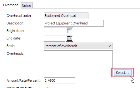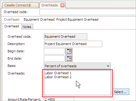 The Overheads field displays the overheads to include in the overhead calculation.