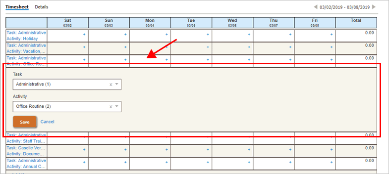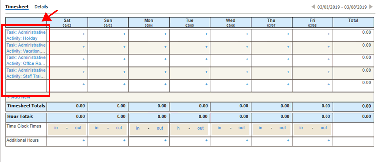 You can add, edit, and delete tasks and activities from your timesheet. The timesheet shows the task and activity in the first column. When you add a task and activity to your timesheet, you can assign hours that you have worked to it.