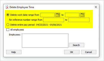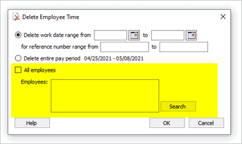 o delete time entries from an employee(s). Remove the checkmark from the All Employees checkbox and then click Search. Use the Search window to select an employee. The Search window will only show employees who have time entires in the pay period that's selected in the Enter Employee Time view.