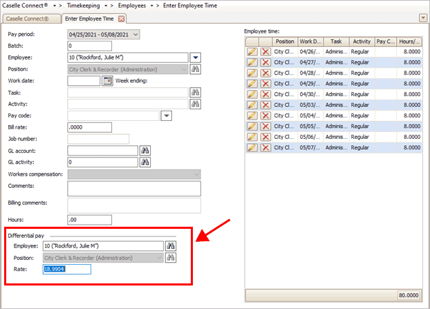 In Single Day Mode, the Differential Pay section is located at the bottom of the view. Use it to enter the employee and differential rate.