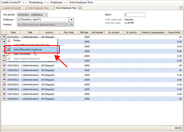 Adding a pay differential to a time entry will update the hours. If the pay differential is linked to a different pay code, a separate line will be added to the employee check information that will show up on the pay check in the Payroll application. The payroll check will combine the hours by pay code.