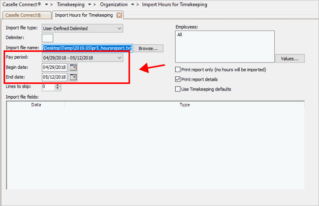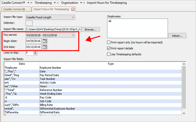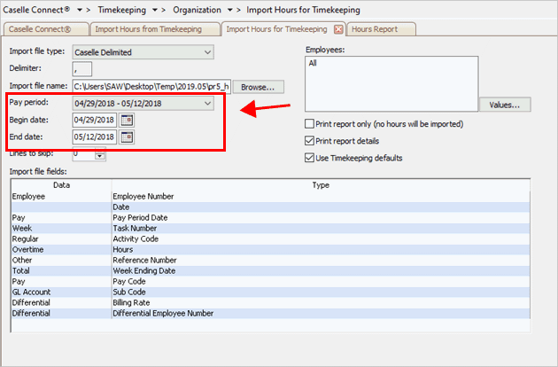 When this checkbox is selected, Connect will use the options that you have selected to print a report that shows the hours that will be included when you import time. It will not import any hours. To import hours, this checkbox must not be selected.