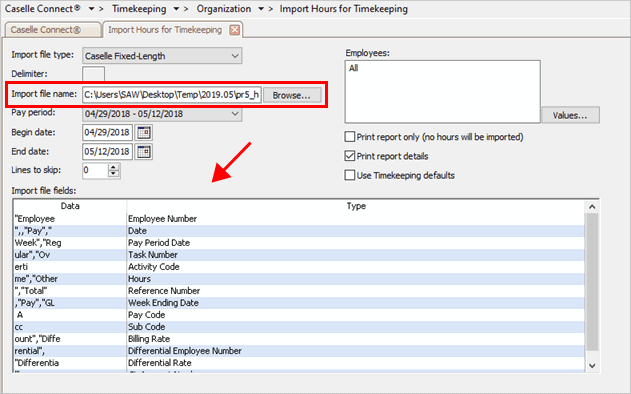 Caselle fixed-length. The import file uses a file layout predefined by Caselle. This file type uses a set value to determine the field length. Field values that exceed the set field length will be truncated. Select Caselle Fixed Length as the Import File Type.