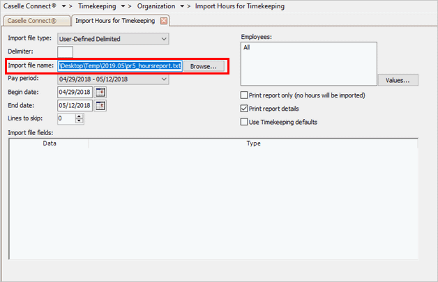 I want to import hours and print a report. Do not select the checkbox titled Print Report Only (No Hours Will be Imported).