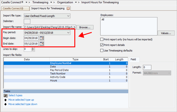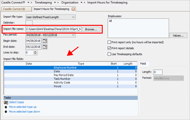 User-defined fixed-length. This import file does not use a file layout predefined by Caselle and it limits the field length and format. Select User-defined Fixed Length as the Import File Type. Then, fill in the options in Import File Fields.