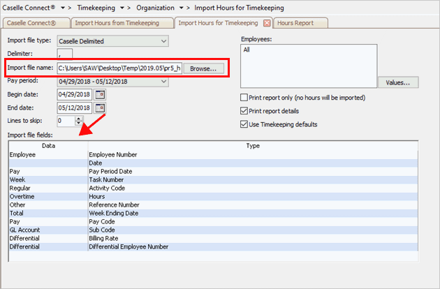 Use Import Hours for Timekeeping to import hours created in a non-Caselle Connect Timekeeping program to use the hours in the Caselle Connect Timekeeping or Payroll programs.