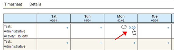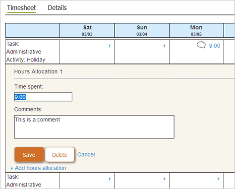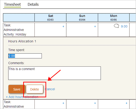 The hours allocation is deleted from the time entry. The timesheet updates the time entry total.