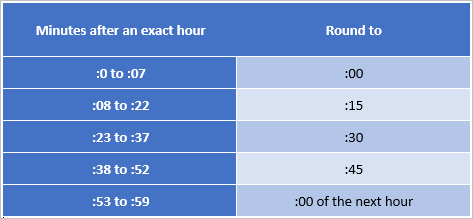 If the clocked time is less than seven minutes, then round down to the previous quarter hour. If the clocked time is greater than seven minutes, then round up to the next quarter hour. For example, if the clock-in time is 7:07 am, then round down to 7:00 am. If the clock-in time is 7:25 am, then round up to 7:30 am.