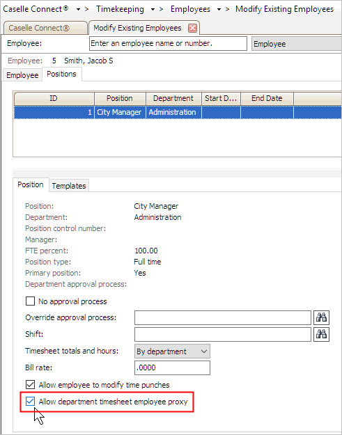 The employee is set up as a proxy for department timesheets.