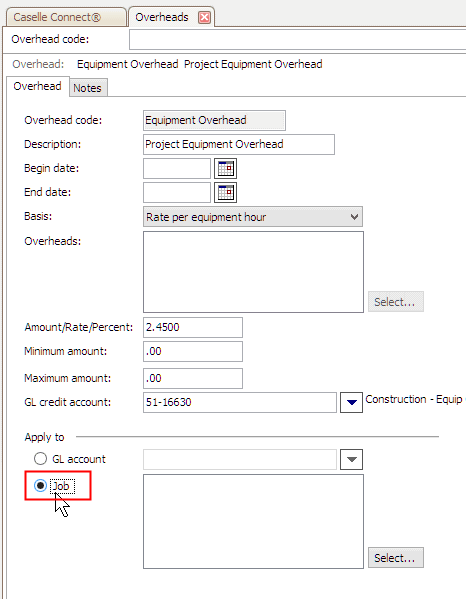 Use job to apply the amount to job types created for construction, maintenance, or cost of remove for a Project Account job. When you run the Update Project Accounting routine, Connect will use the job number that is assigned to the transaction as the job number that will receive the overhead amount.
