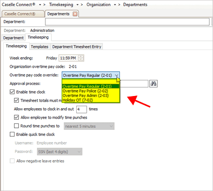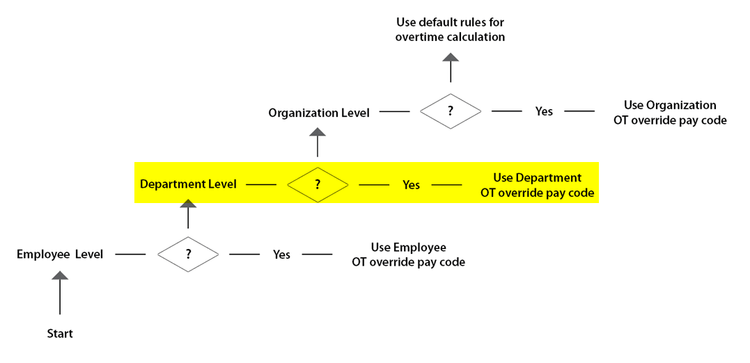 If there's an overtime override pay code at the organization level, the department overtime override pay code will override the overtime pay code that's assigned to the organization.