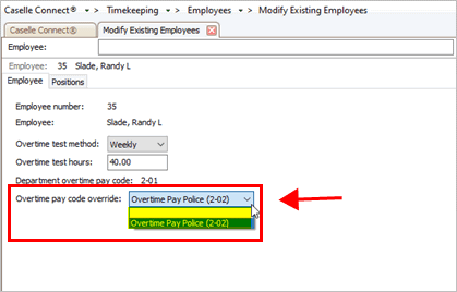 For example, Casey works in the police department as an administrative assistant. The department uses an overtime override pay code to calculate overtime for the police officers who work a shift. Because Casey works a standard 40 hour work week, the payroll clerk assigns an overtime override pay code to Casey so Casey's payroll check will not use the overtime override pay code that is assigned to the rest of the department.