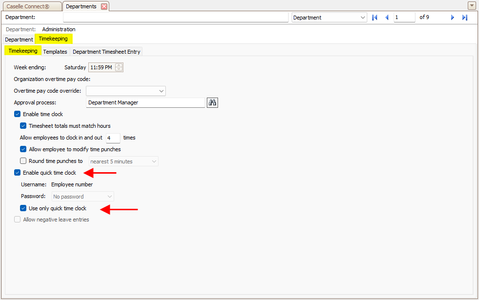 2. Look up the department that you want to restrict to using Quick Time Clock.