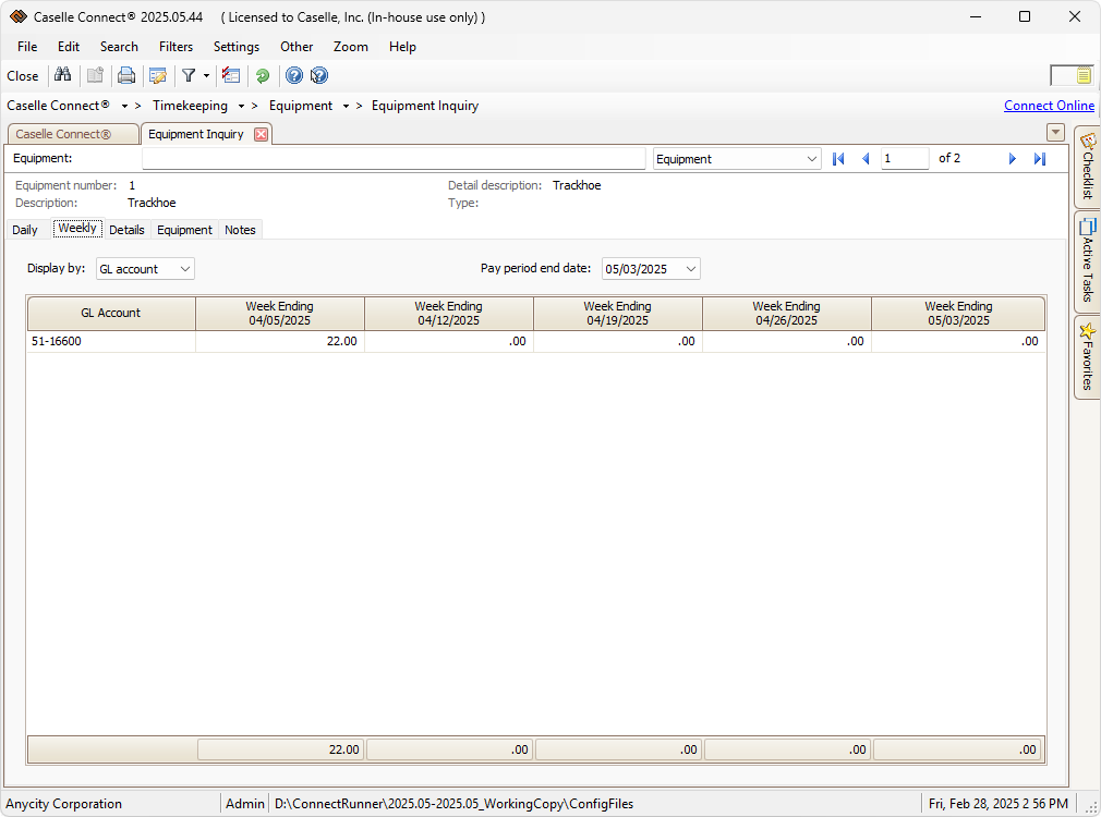 Use the Weekly tab in Equipment Inquiry to look up equipment entry totals by week ending date. The view will use the pay period end date to show entries.