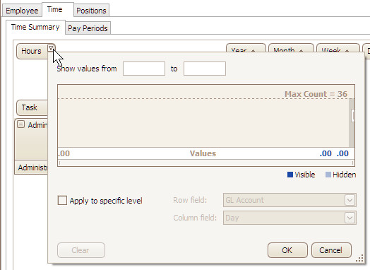 When you see the Filter mini-button , like this... , you can click on it to change the selection criteria. This is the selection criteria form for filtering hours however, the fields on the form will change based on the filtering type, so the selection form may not look exactly like this if you're setting up the selection criteria for a different type. You can use the options on the selection form to filter the values that display on the screen.