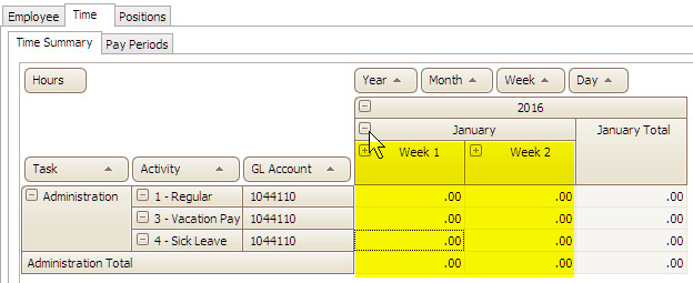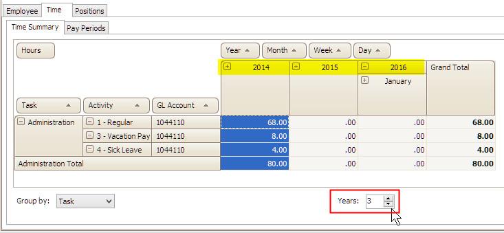 Use the Years field to add or remove columns that display time entries by year. When you enter 3, the display changes to show three years, see the highlighted section. Increasing the number will add columns to the display and decreasing the number will remove columns from the display.