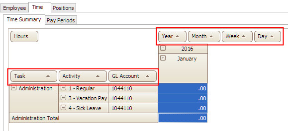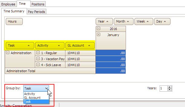 Use the Group By field to filter time entries by task, activity, or GL account. Changing the Group By value will change the display order of the highlighted row to show the Group By value as the first column in this section.