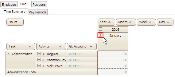 The employee's time entries display on the Time Summary subtab. You can click the [+] to view additional detail or click the [-] to hide detail.