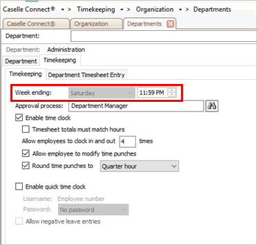 The week ending day is the last day in the workweek. Timekeeping uses the week ending day and time to calculate overtime. The Organization setting will override the Department setting.